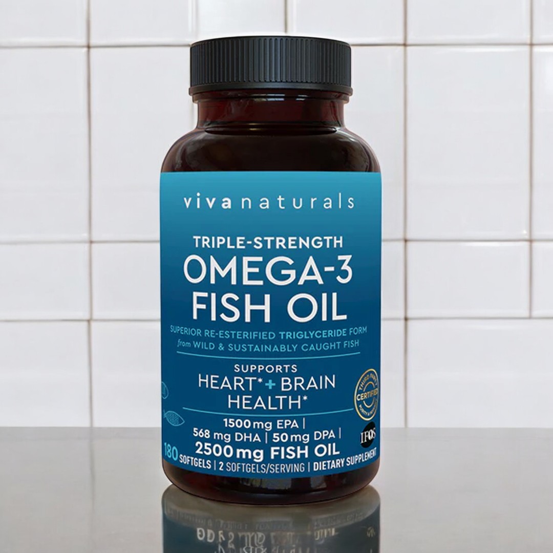 Viva Naturals offers a range of Omega-3 Fish Oil supplements designed to support heart, brain, eye, and joint health. Their Triple-Strength Omega-3 Fish Oil provides 2,500 mg of fish oil per serving, delivering 1,500 mg of EPA and 568 mg of DHA. These essential fatty acids are known for their anti-inflammatory properties and cardiovascular benefits. The fish oil is sourced from wild, sustainably caught fish and undergoes a purification process to remove harmful toxins, ensuring a high-quality supplement.